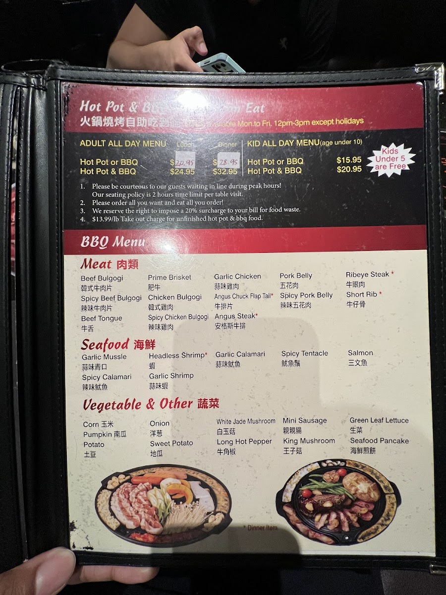 - Hot Pot and Korean BBQ: This section includes selections of raw meats, seafood, and vegetables intended for cooking at the table, with choices of broth bases and seasoning options.
